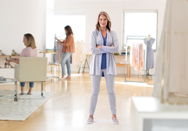 Woman standing in a clothing store with others in the background, this time without a caution sign