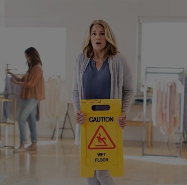 A person holding a yellow "Caution Wet Floor" sign in a clothing store
