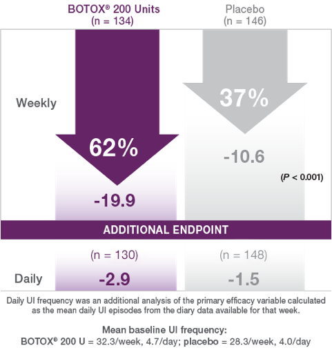 Study 1 and 2 design: Double-blind, placebo-controlled, randomized, multicenter, phase 3, 52-week clinical studies in patients with UI associated with OAB due to SCI or MS who had an inadequate response to or were intolerant of at least 1 anticholinergic medication. These patients were randomized to receive either BOTOX® 200 Units (n = 227), BOTOX® 300 Units (n = 223), or placebo (n = 241). Primary endpoint was the mean change from baseline in weekly UI episodes at week 6. ANCOVA model with last-observation-carried-forward (LOCF) imputation was used. Study 1 mean baseline UI frequency: BOTOX® 200 Units = 32.3/week, 4.7/day, placebo = 28.3/week, 4.0/day. Study 2 mean baseline UI frequency: BOTOX® 200 Units = 32.7/week, 4.6/day, placebo = 36.8/week, 5.3/day.1-3