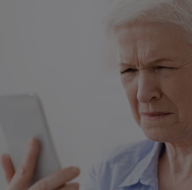 Person in a blue shirt with squinting eyes looking at a smartphone