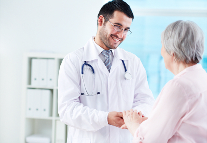 Doctor in a lab coat holding hands with a patient, comforting gesture