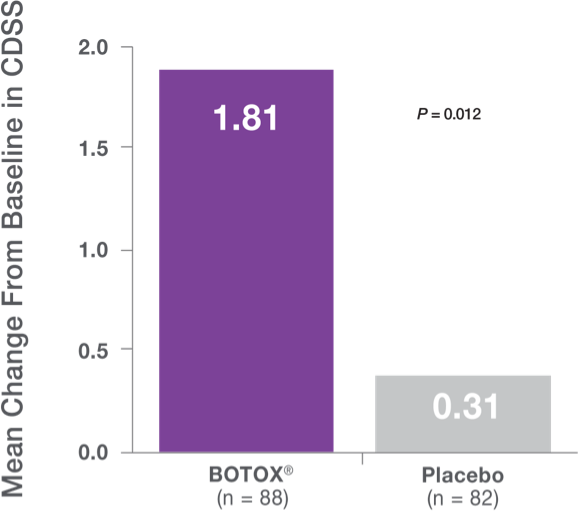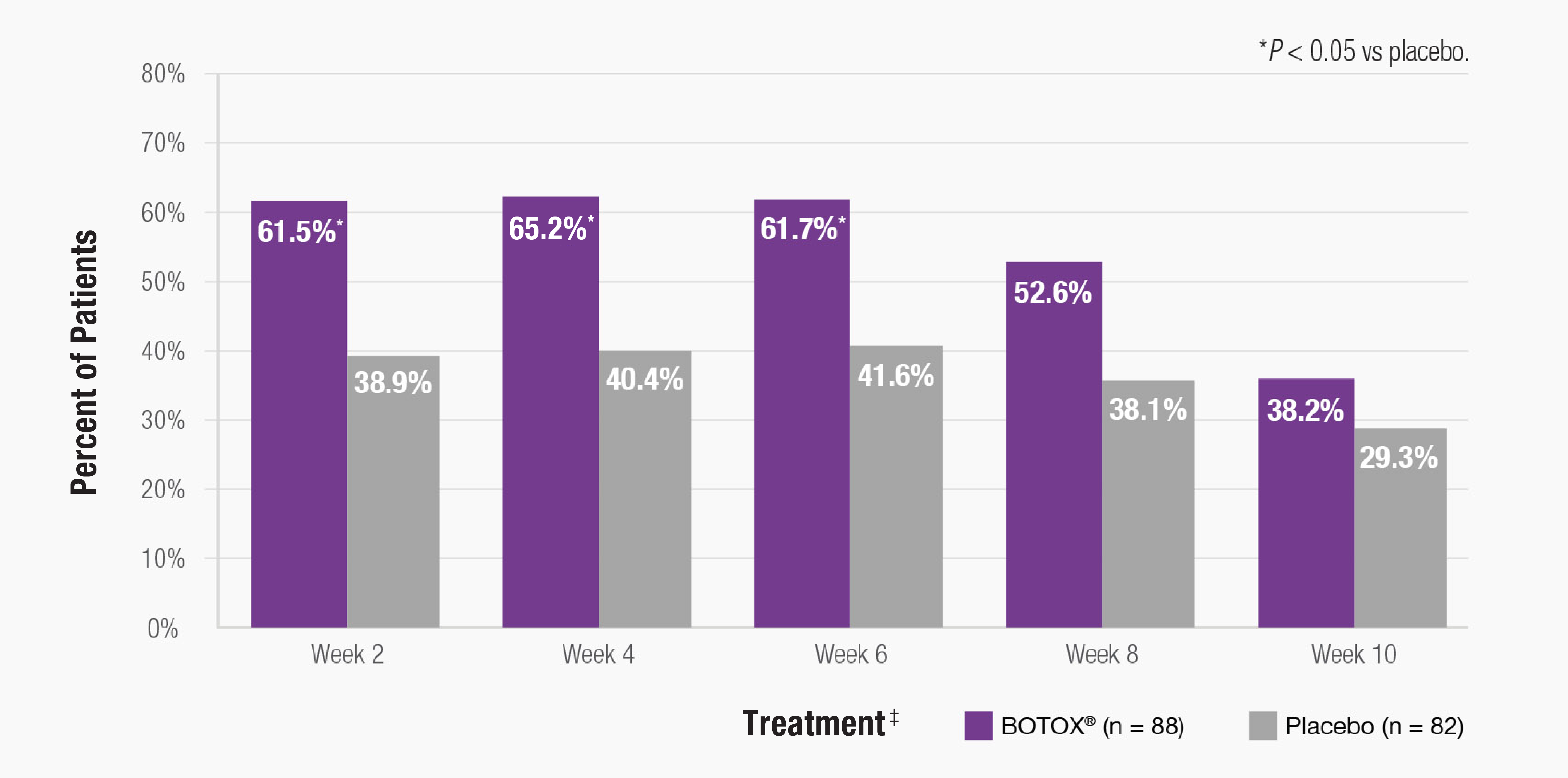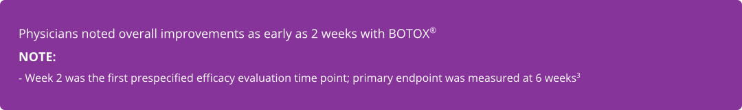 • 62% of BOTOX® patients had an improvement on the Physician Global Assessment scale vs 42% for placebo (P < 0.05)4