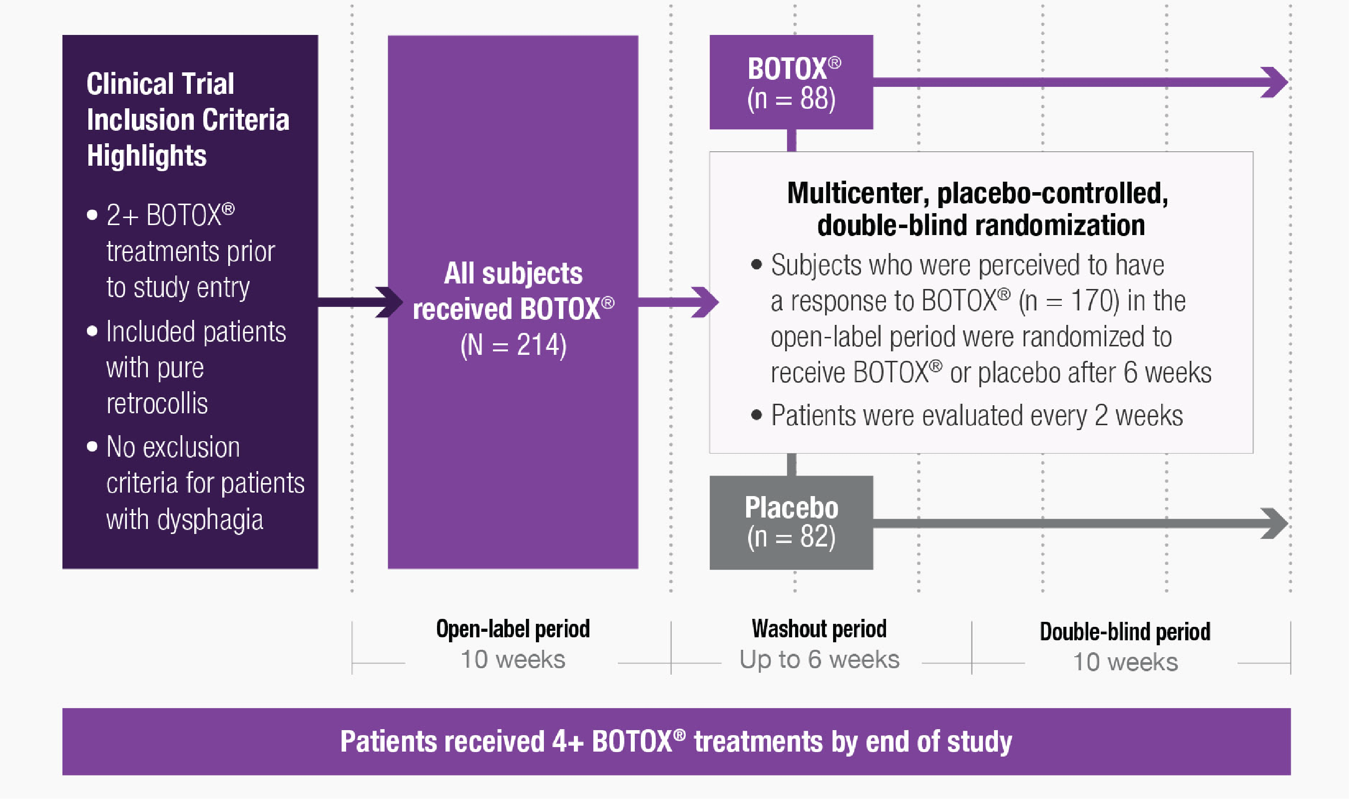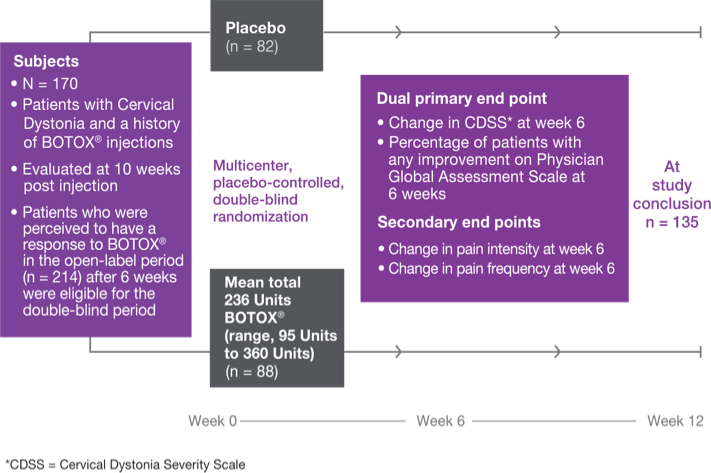 Represents total patients randomized for each treatment group. At different follow-up time points, n-values range from 72 to 88 for BOTOX® and 58 to 82 for placebo.
