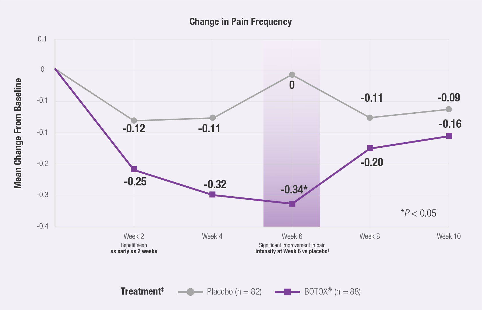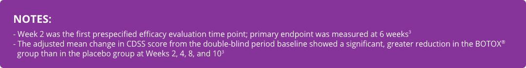 BOTOX® improved neck pain intensity and frequency associated with Cervical Dystonia beginning at 2 weeks