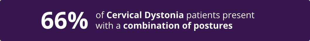 REFERENCES: 1. Chan J, Brin MF, Fahn S. Idiopathic cervical dystonia: clinical characteristics. Mov Disord. 1991;6(2):119-126. 2. LaHue SC, Albers K, Goldman S, et al. Cervical dystonia incidence and diagnostic delay in a multiethnic population. Mov Disord. 2020;35(3):450-456. 3. Consky ES, Lang AE. Clinical assessments of patients with cervical dystonia. In: Jankovic J, Hallett M, eds. Therapy With Botulinum Toxin. New York, NY: Marcel Dekker, Inc; 1994:211-237. 4. Jankovic J, Leder S, Warner D, Schwartz K. Cervical dystonia: clinical findings and associated movement disorders. Neurology. 1991;41(7):1088-1091. 5. Charles PD, Adler CH, Stacy M, et al. Cervical dystonia and pain: characteristics and treatment patterns from CD PROBE (Cervical Dystonia Patient Registry for Observation of OnabotulinumtoxinA Efficacy). J Neurol. 2014;261(7):1309-1319.