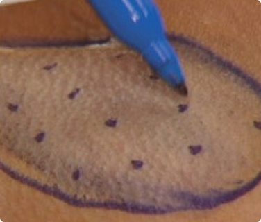 Inject to a depth of approximately 2 mm and at a 45° angle to skin surface with bevel side up. Be sure not to inject directly on ink mark to avoid a permanent tattoo effect. After injection, clean treated area with alcohol.