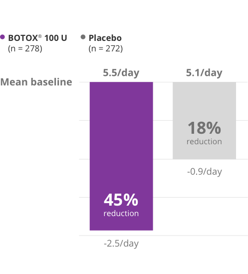 100 Units = 5.5/day, placebo = 5.1/day. Study 2 mean baseline UI frequency: BOTOX® 100 Units = 5.5/day, placebo = 5.7/day.1
