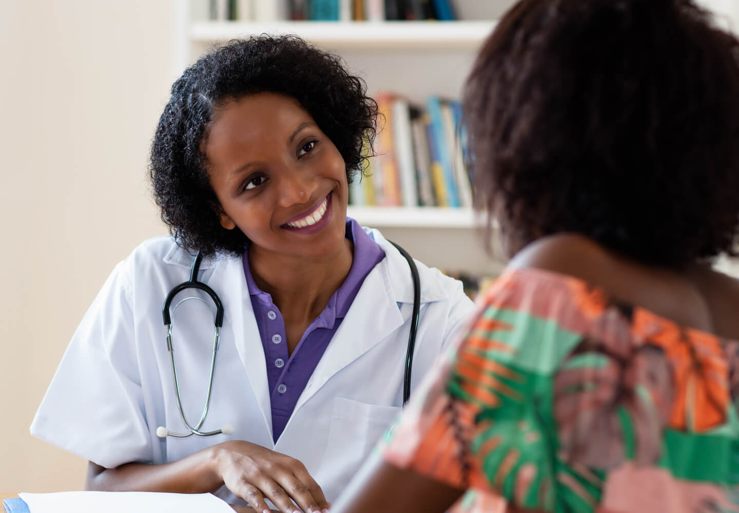 A doctor in a lab coat with a stethoscope speaking to a patient