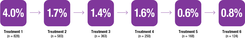 NOTE: A total of 430 patients completed the entire 3-year extension. The median duration of effect of BOTOX® was 7.6 months, and 65.7% of patients had a retreatment time > 6 months. Thus, many of the patients who completed the 3-year extension received < 6 treatments. This is one of the reasons for the smaller n-values at 5 and 6 treatments. Subjects discontinued for various reasons, including but not limited to, personal reasons, protocol violations/lost to follow-up, adverse events, lack of efficacy, etc.