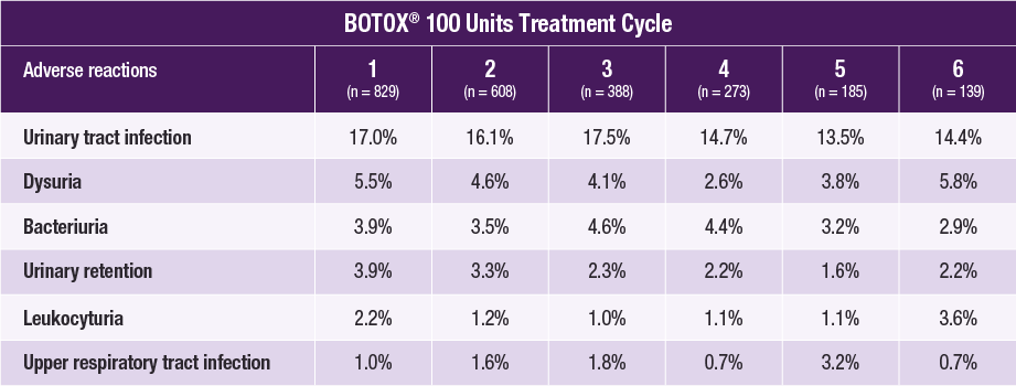 • In pivotal studies, 1.4% of BOTOX® patients (n = 552) discontinued due to adverse events vs 1.7% of placebo patients (n = 542)