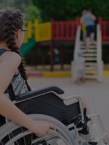 A child in a wheelchair with children and playground in the background