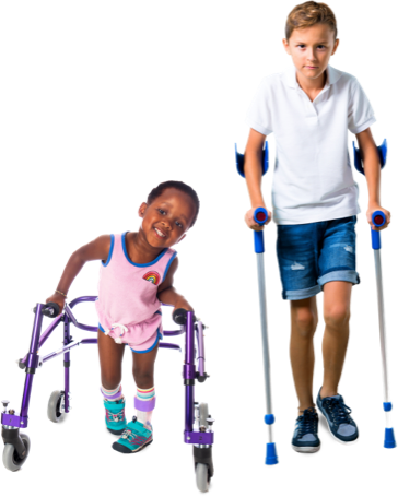 Two children with mobility aids: one with a walker and the other with crutches