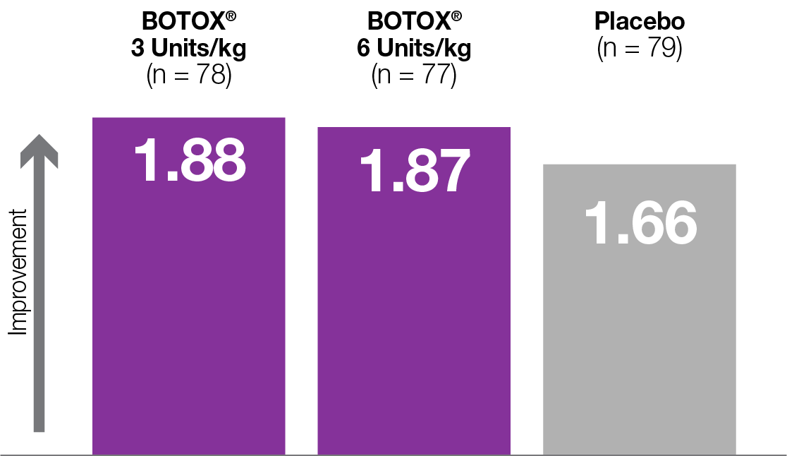 Improved CGI All patients received weekly physical/occupational therapy (PT/OT), but the BOTOX® groups showed greater improvements vs placebo across all time points1-3,§