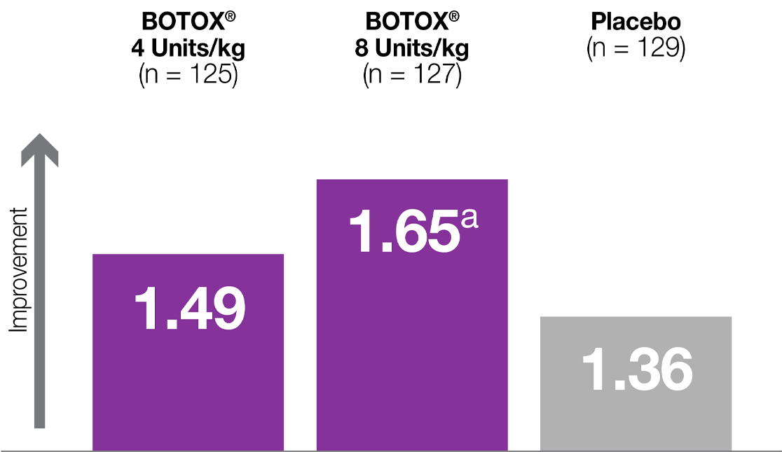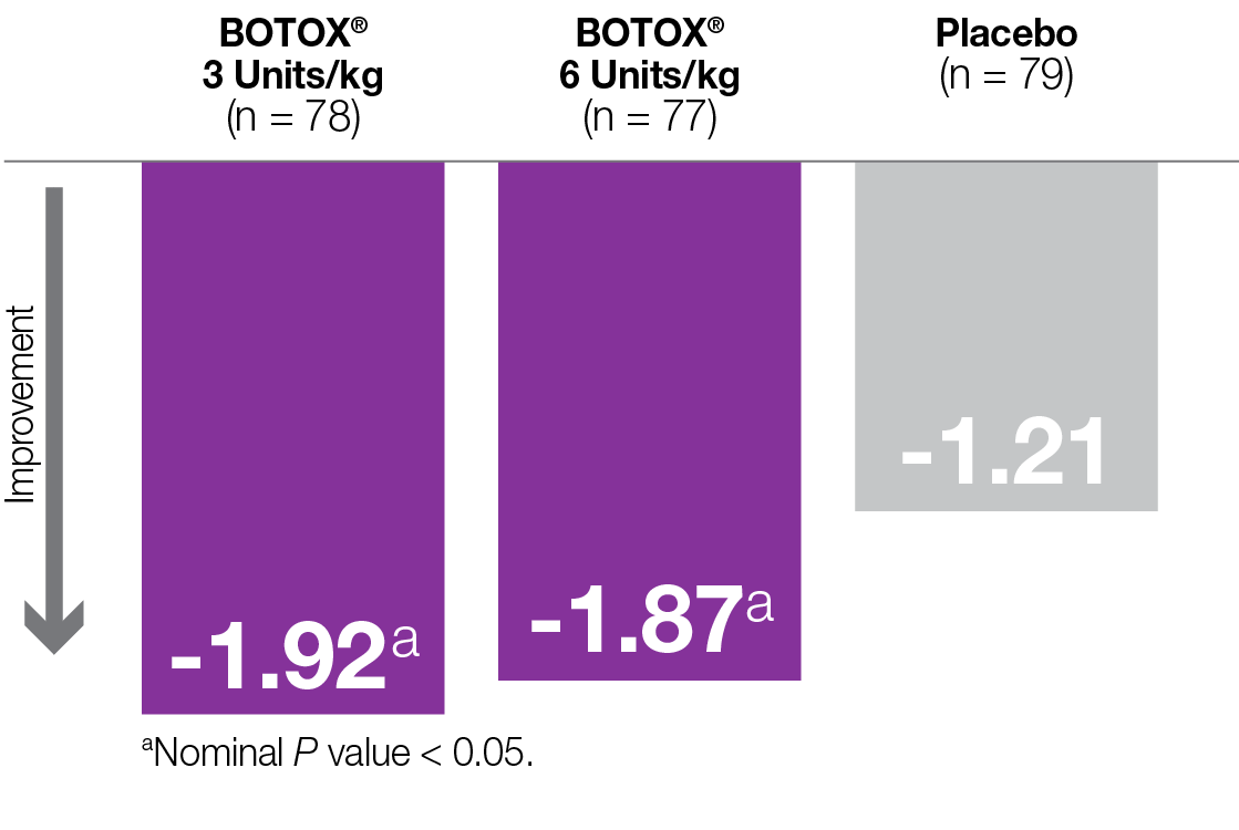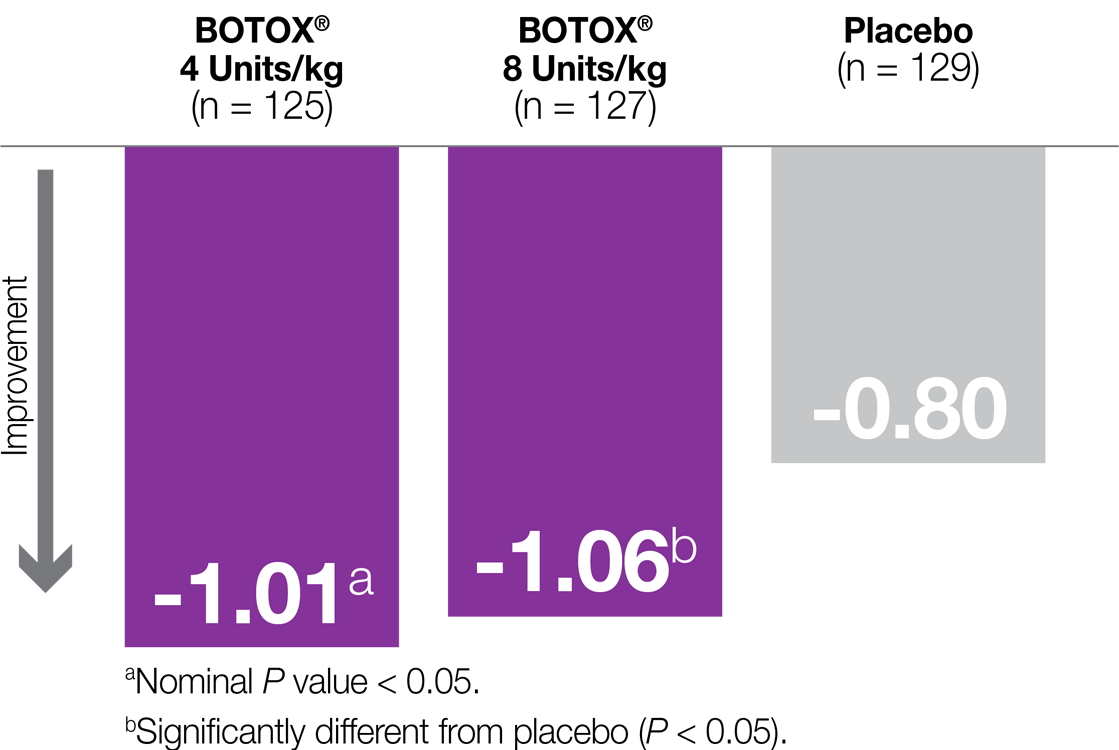 §CGI scores in the Pediatric ULS study numerically favored BOTOX® vs placebo, but the difference was not statistically significant. In the Pediatric LLS study, CGI scores were statistically significant for the BOTOX® 8 Units/kg group only.