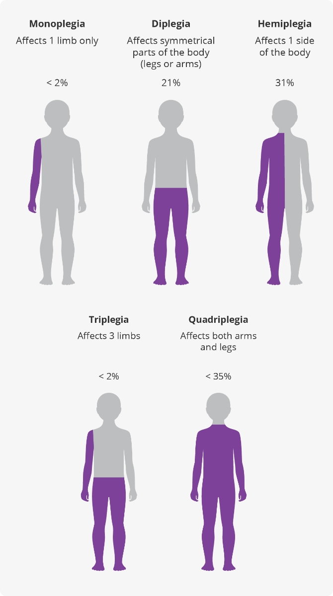 Cerebral palsy can be described by the part of the body affected and the way it affects one's movement. Nearly 80% of children with cerebral palsy have Spasticity (N = 451).1 Other causes of Pediatric Spasticity include traumatic brain injury, stroke, MS, and spinal cord injury.2-9